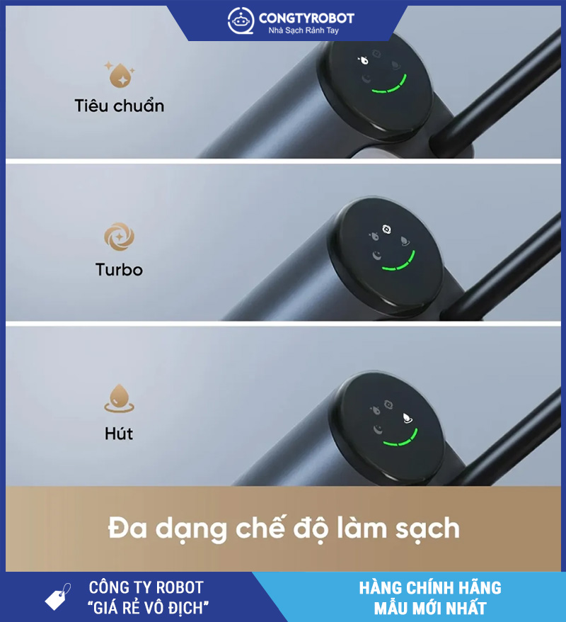 Tùy vào loại sàn và mức độ bẩn, bạn chỉ cần chuyển chế độ bằng một nút bấm, vừa tiết kiệm pin – tiết kiệm nước – tối ưu hiệu quả dọn dẹp.