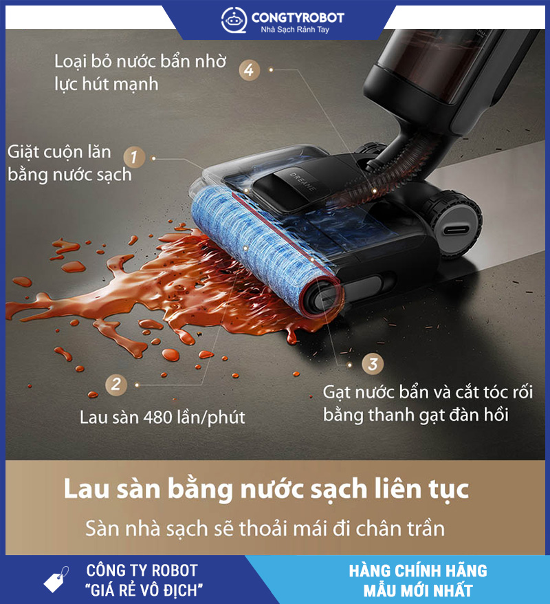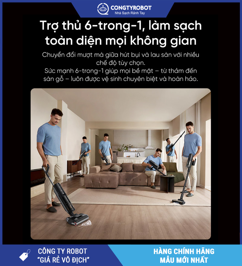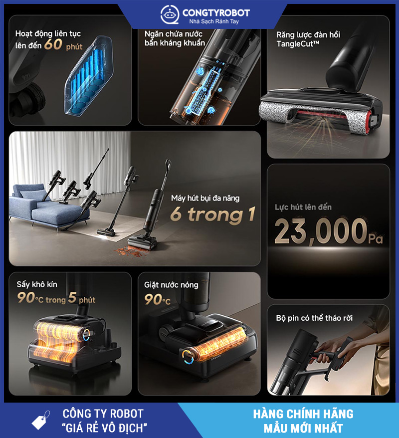 - 6 chế độ dọn dẹp trong 1 – Hút bụi, lau sàn, hút khô – ướt, tự vệ sinh cuộn lăn