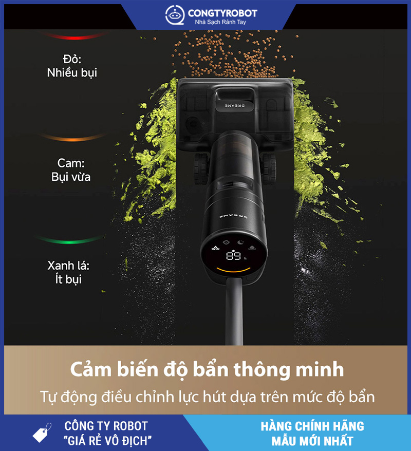 Dreame H13 được trang bị cảm biến độ bẩn, giúp tự động điều chỉnh lực hút và lượng nước lau tùy theo mức độ bụi bẩn trên sàn: