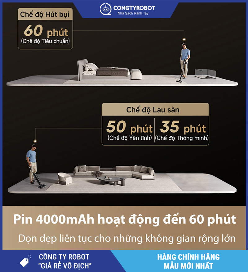 - Dọn dẹp toàn bộ căn hộ 100–120m² chỉ với 1 lần sạc