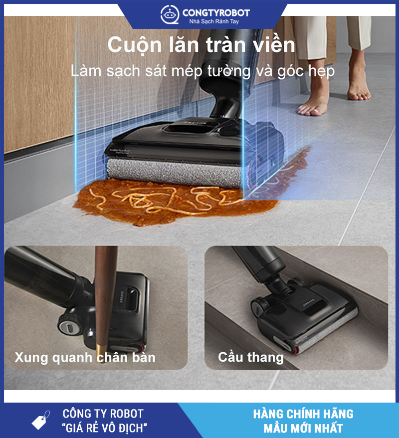 Một vấn đề thường gặp ở nhiều máy hút bụi lau nhà là bỏ sót bụi bẩn sát mép tường do thiết kế cuộn lăn không sát cạnh. Dreame H13 FlexReach khắc phục điều đó bằng cuộn lăn tràn viền 2 cạnh, giúp: