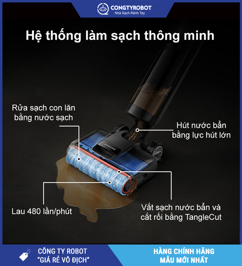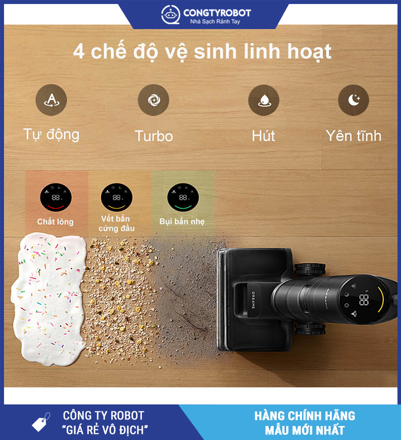 - Chế độ thông minh: Tự điều chỉnh lực hút & lượng nước lau dựa trên độ bẩn thực tế