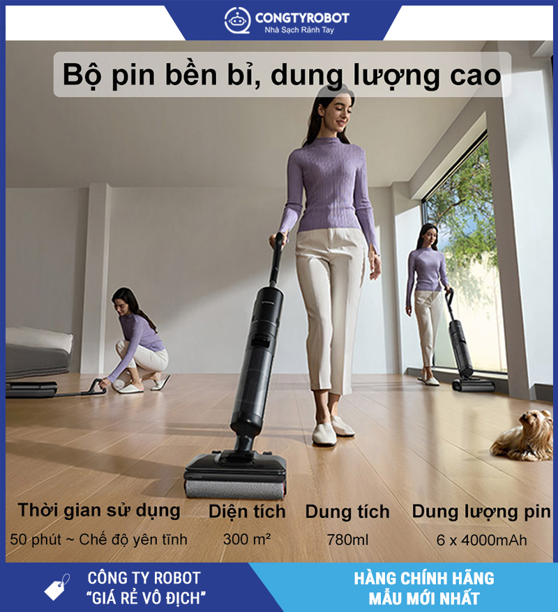- Giặt & sấy nóng 90°C – pin dùng 50 phút – 4 chế độ làm sạch thông minh