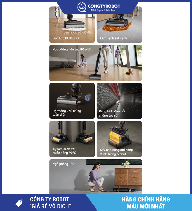 - Lực hút 18.000Pa – chống rối tóc tự động – cuộn lăn tràn viền