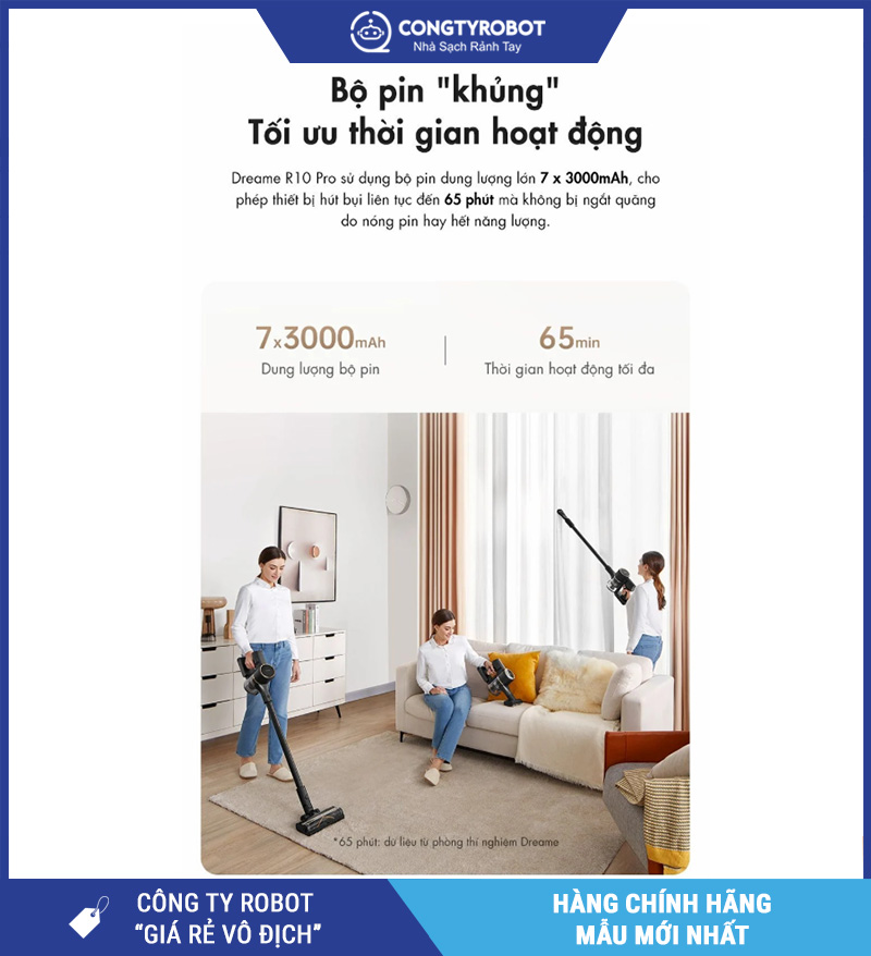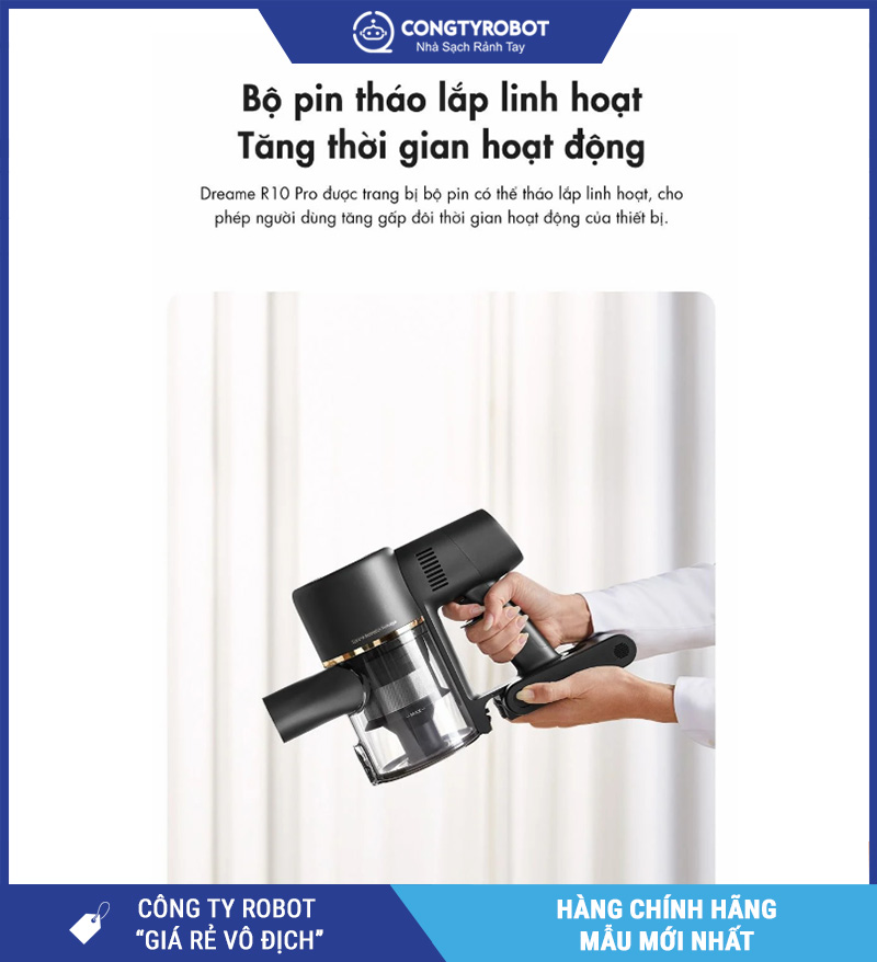 Là sản phẩm thuộc hệ sinh thái Dreame – thương hiệu nổi bật trong lĩnh vực thiết bị gia dụng thông minh, Dreame R10 Pro được đánh giá cao nhờ sự kết hợp giữa hiệu năng vượt trội, thiết kế công thái học và pin linh hoạt tháo rời.