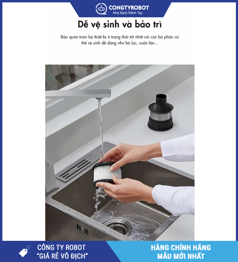 Bộ lọc HEPA và các linh kiện như đầu hút, màng lọc, ống dẫn khí đều có thể tháo ra và rửa sạch bằng nước – rất tiện lợi cho việc vệ sinh định kỳ.