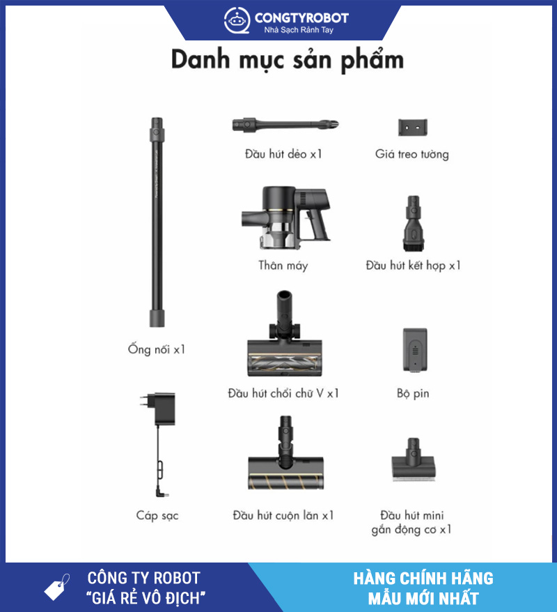 | Phụ kiện đi kèm | Đầu hút sàn, đầu hút khe, đầu hút mini, chổi mềm, ống nối linh hoạt |