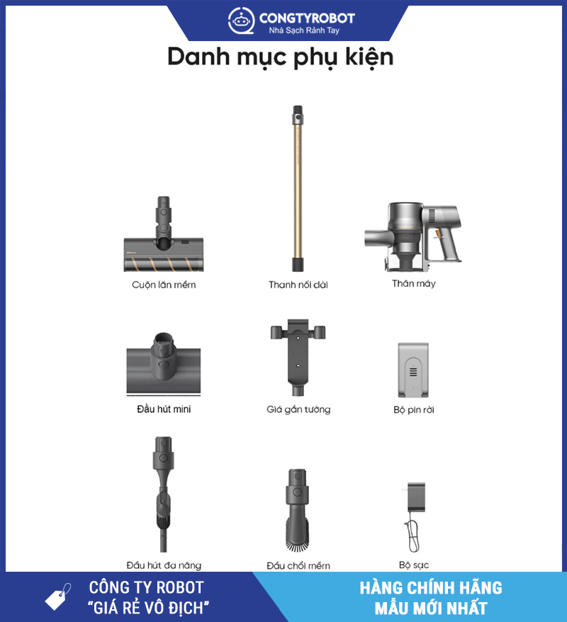 | Phụ kiện đi kèm | Đầu hút sàn, khe, bàn chải mini, chổi mềm, giá treo |