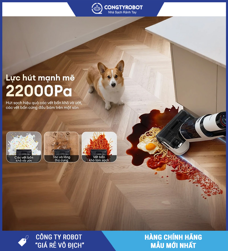 Lực hút mạnh 22.000Pa, hút bụi – lau – làm khô 3 trong 1
