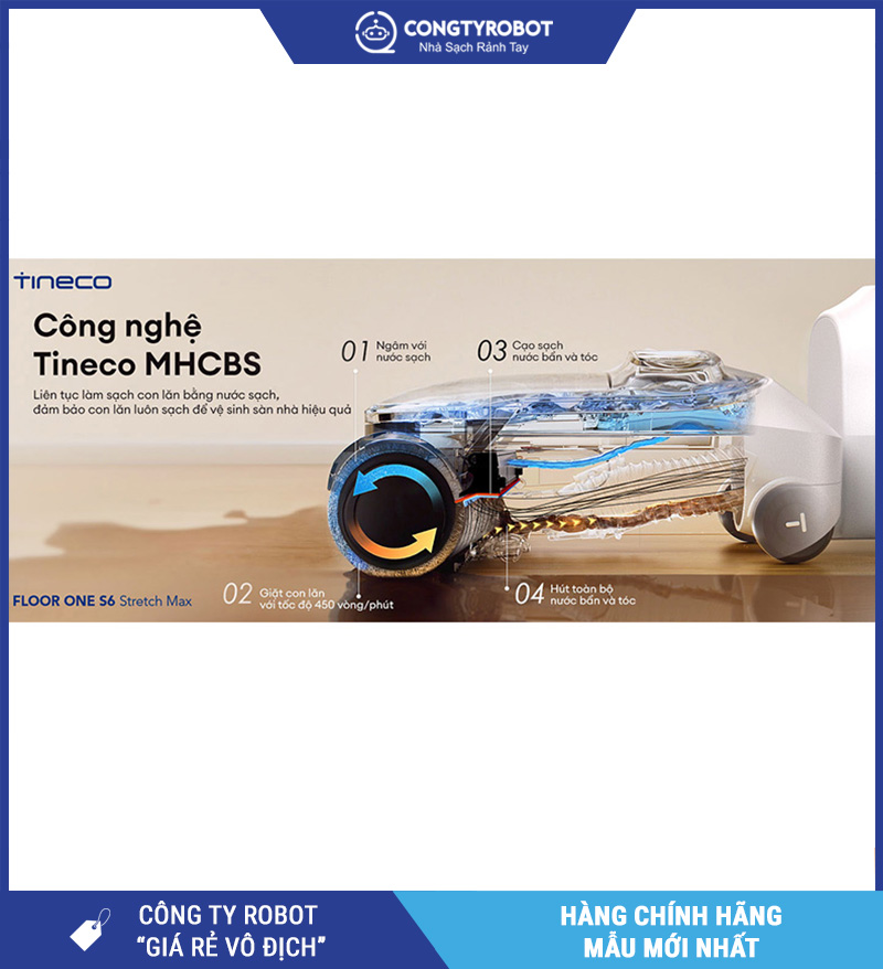 Khác biệt hoàn toàn với những máy lau nhà thông thường, Tineco S6 Stretch Max ứng dụng công nghệ độc quyền MHCBS (Mop Head Continuous Brush Self-Cleaning System):