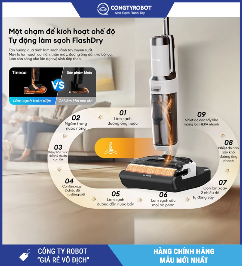 Nhưng với Tineco Floor One S6 Stretch Max, bạn chỉ cần nhấn nút, hệ thống FlashDry sẽ tự động làm sạch và sấy khô toàn bộ con lăn.