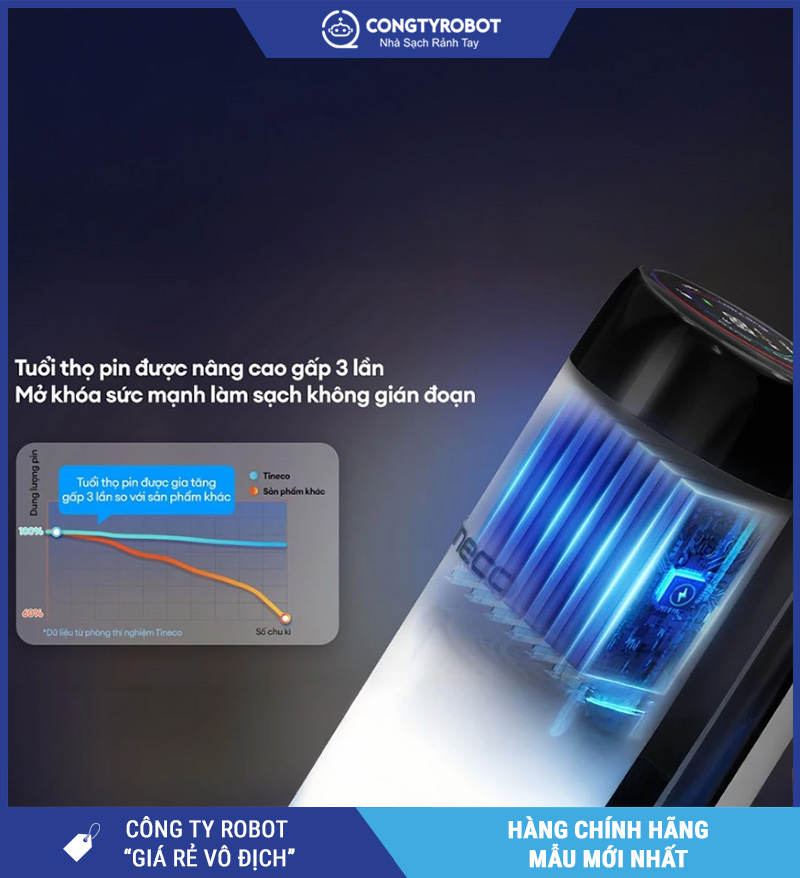 Không chỉ mạnh về tính năng, Tineco Floor One S6 Stretch Max còn được đánh giá cao nhờ viên pin Li-ion thế hệ mới, dung lượng cao – độ bền vượt trội.