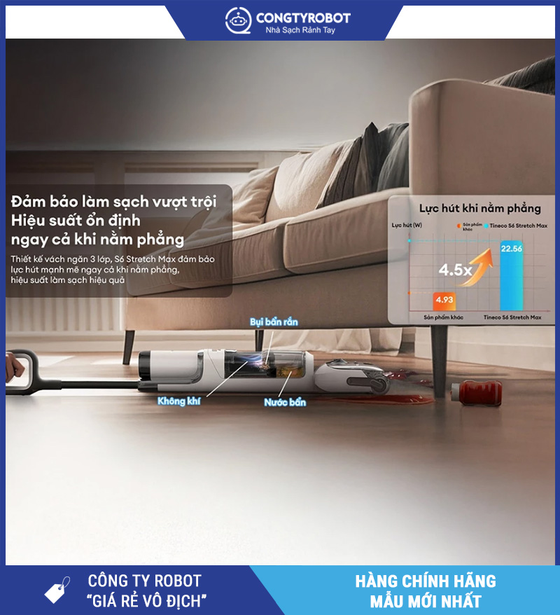 Nhưng với Tineco Floor One S6 Stretch Max, máy vẫn duy trì công suất hút mạnh 22.000Pa dù đang nằm sát mặt sàn.