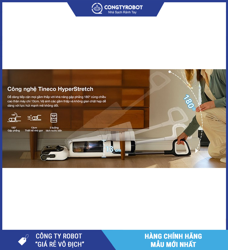 Với nhiều dòng máy hút lau cồng kềnh, việc làm sạch gầm giường, gầm tủ, gầm ghế là điều gần như “bất khả thi”. Nhưng với Tineco S6 Stretch Pro, mọi chuyện trở nên đơn giản nhờ thiết kế thân máy linh hoạt, gập phẳng tới 180°.