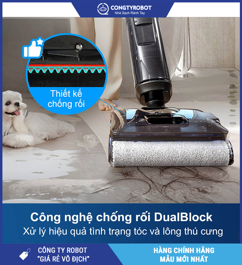 Vấn đề tóc rối và lông thú làm kẹt chổi là nỗi ám ảnh khi dùng máy hút lau nhà. Tineco giải quyết triệt để với công nghệ DualBlock thông minh: