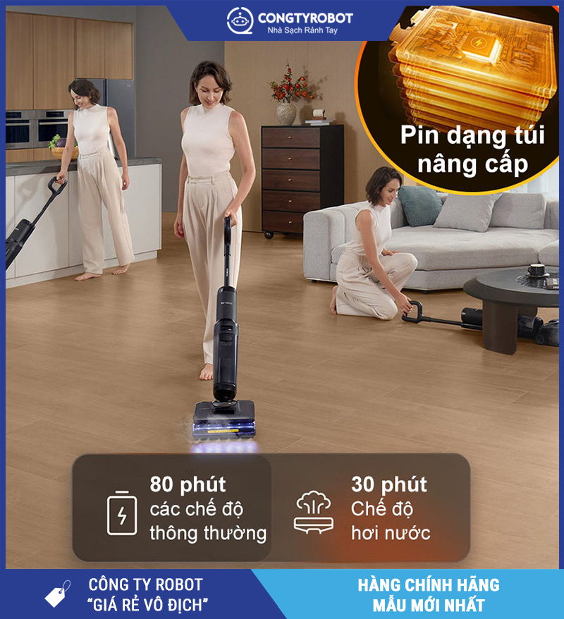 Hoạt động liên tục đến 80 phút ở chế độ Eco – đủ để vệ sinh toàn bộ căn hộ 100–150m² mà không cần sạc lại giữa chừng