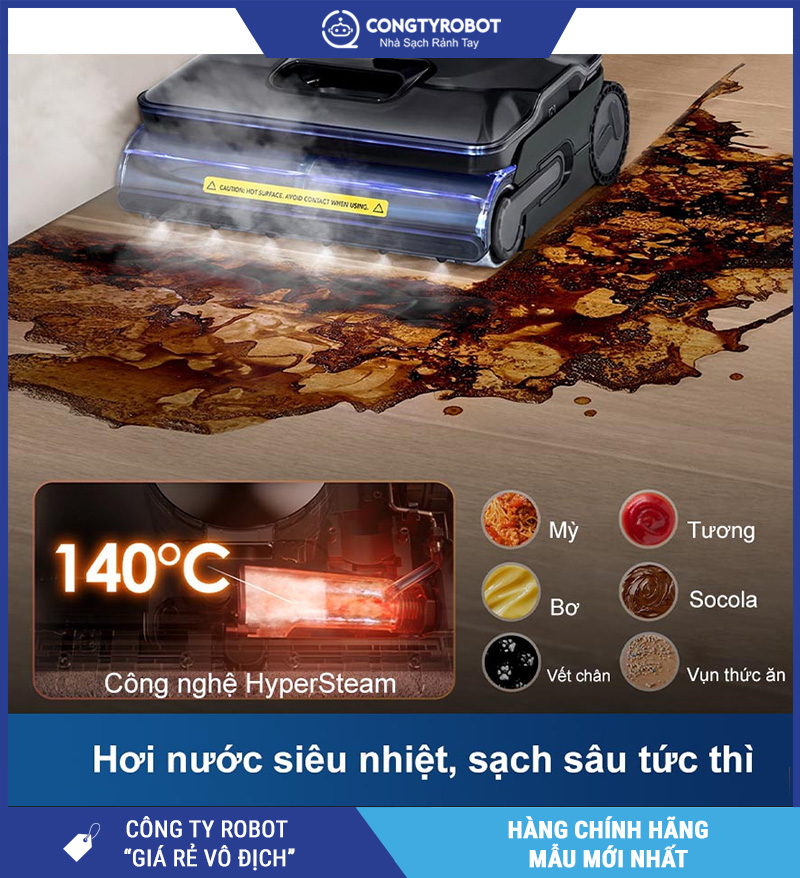 Hơi nước nóng 140°C giúp diệt khuẩn và loại bỏ vết bẩn cứng đầu