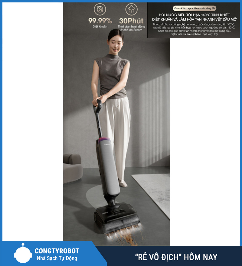 Trang bị công nghệ hơi nước HyperSteam siêu nhiệt với mức nhiệt đạt tới 140°C, giúp đánh bật mọi loại vi khuẩn, bụi mịn, vết bẩn lâu ngày như dầu mỡ, thức ăn khô cứng hay vết dính trên sàn.