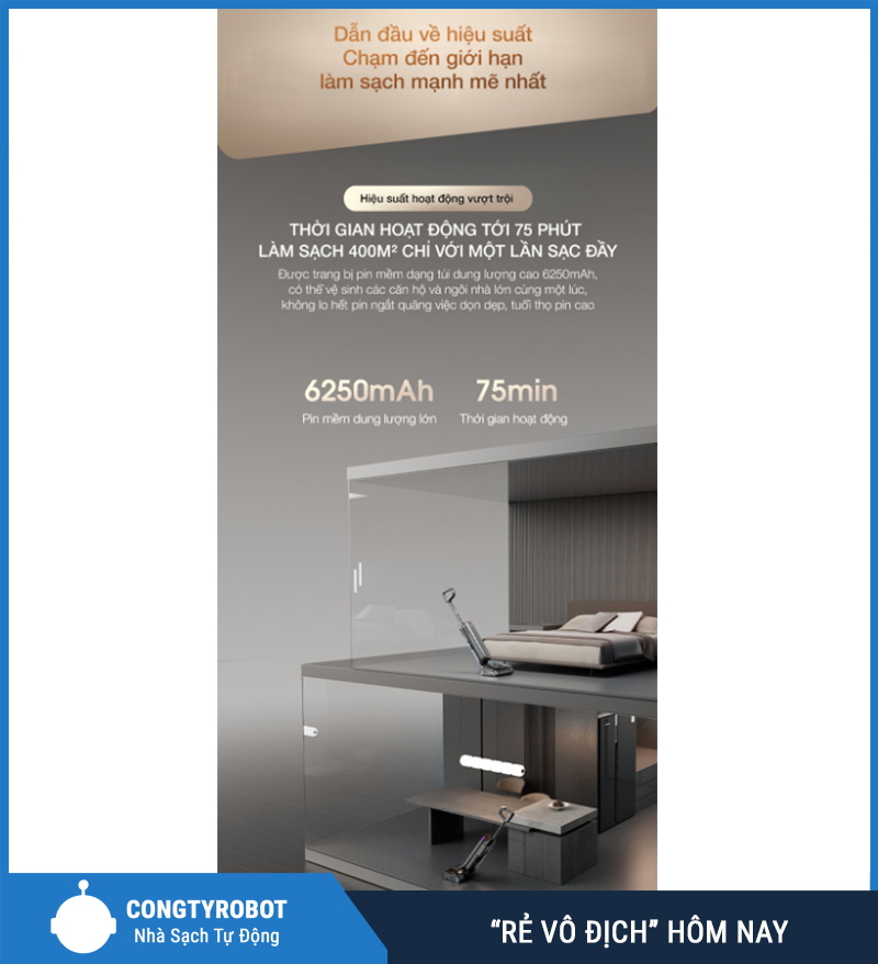 Viên pin lớn giúp người dùng có thể dọn dẹp toàn bộ căn hộ 100–150m² chỉ với một lần sạc.
