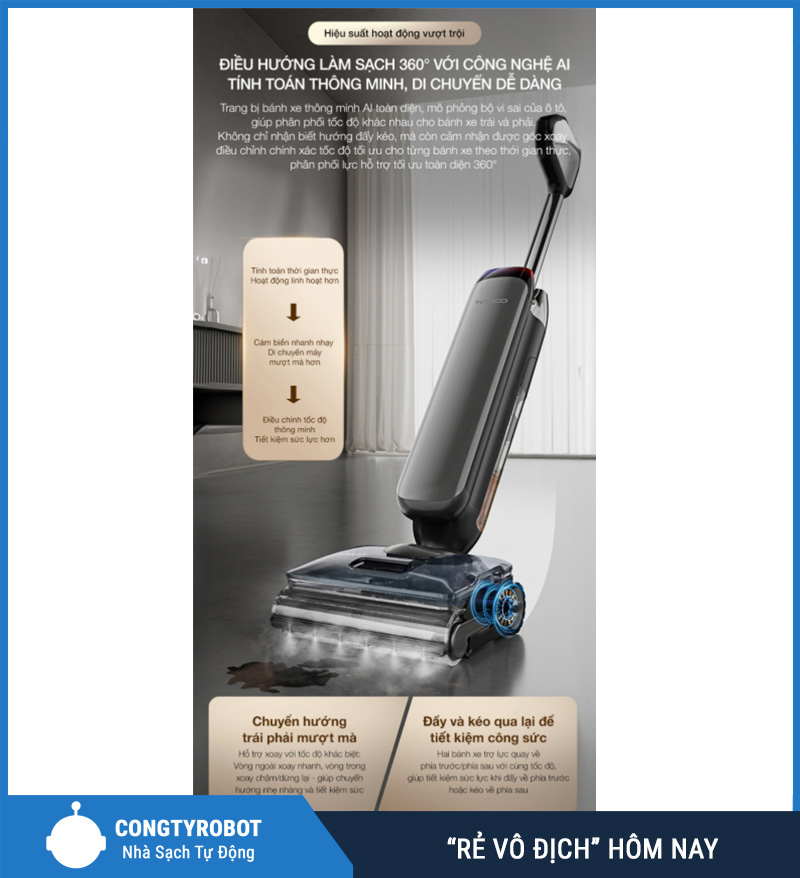 Sở hữu hệ thống bánh xe thông minh tích hợp cảm biến AI, cho phép máy xoay 360 độ linh hoạt, dễ dàng điều hướng quanh các vật cản nhỏ như chân bàn, ghế, kệ thấp.