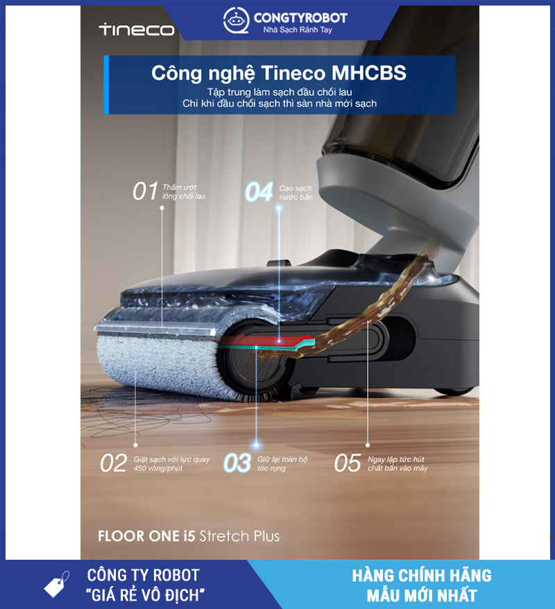 Không giống các máy lau sàn thông thường – nơi con lăn dễ bị dơ sau vài mét lau, Tineco i5 Stretch Plus được tích hợp công nghệ MHCBS™ (Mop Head Continuous Brush Self-Cleaning System).