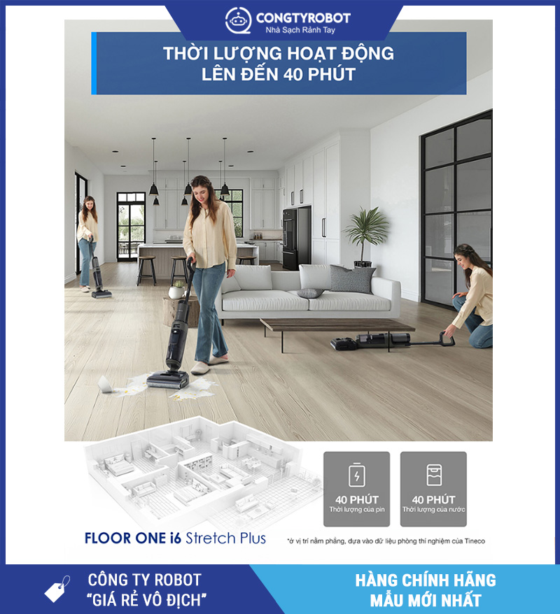 Với Tineco i6 Stretch Plus, máy được trang bị pin dung lượng cao, cho thời gian hoạt động liên tục đến 40 phút (ở chế độ yên tĩnh).