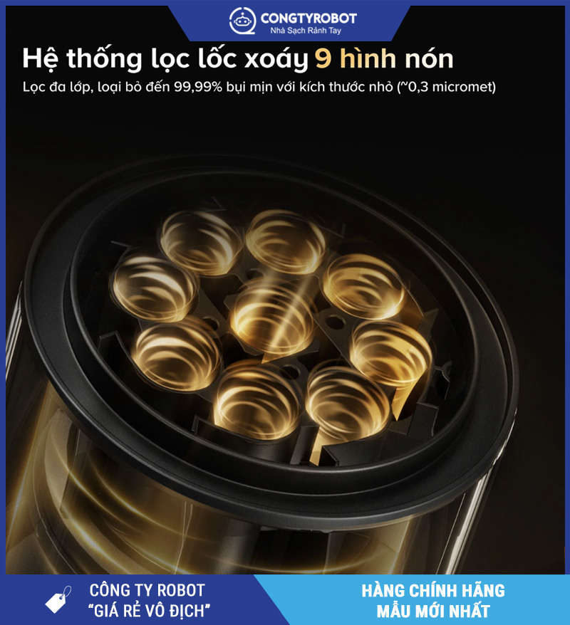 Roborock F25 Ace Combo sử dụng hệ thống lọc lốc xoáy 9 tầng hình nón, tương đương các dòng máy lọc không khí cao cấp – giúp loại bỏ gần như toàn bộ bụi mịn, phấn hoa, vi khuẩn bay trong không khí.