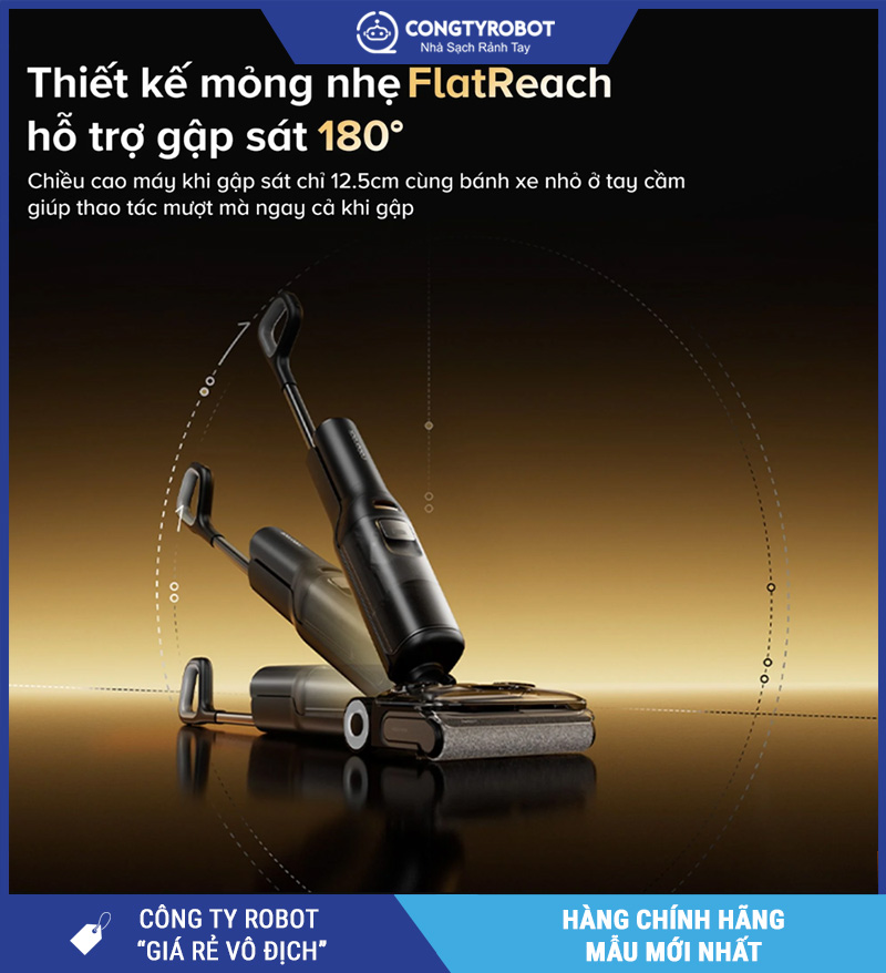 FlatReach™ là thiết kế độc quyền giúp Roborock F25 Ace Combo dễ dàng luồn sâu vào gầm giường, tủ, ghế thấp mà không cần khom lưng hoặc di chuyển đồ nội thất cồng kềnh.