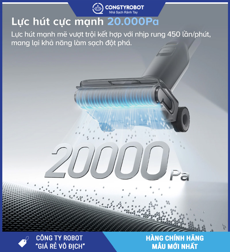 Lực hút mạnh mẽ 20.000Pa – Làm sạch cả bụi khô lẫn chất lỏng