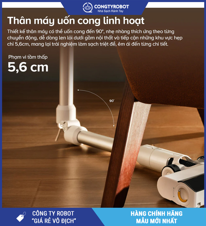 Một trong những thiết kế thông minh đáng giá nhất trên Roborock H60 chính là khả năng gập thân máy 90°. Nhờ tính năng này, người dùng có thể dễ dàng đưa đầu hút vào các vị trí thấp như gầm giường, gầm tủ, ghế sofa mà không cần cúi người quá sâu – rất hữu ích cho người lớn tuổi hoặc nhà có không gian hẹp.