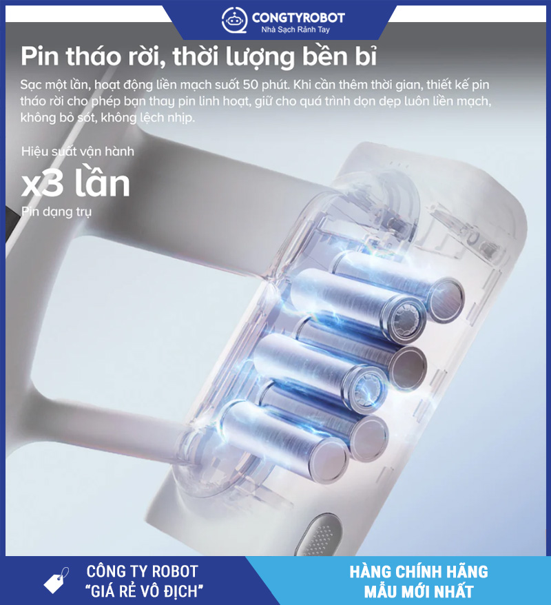 Hoạt động liên tục 50 phút với pin tháo rời dung lượng lớn