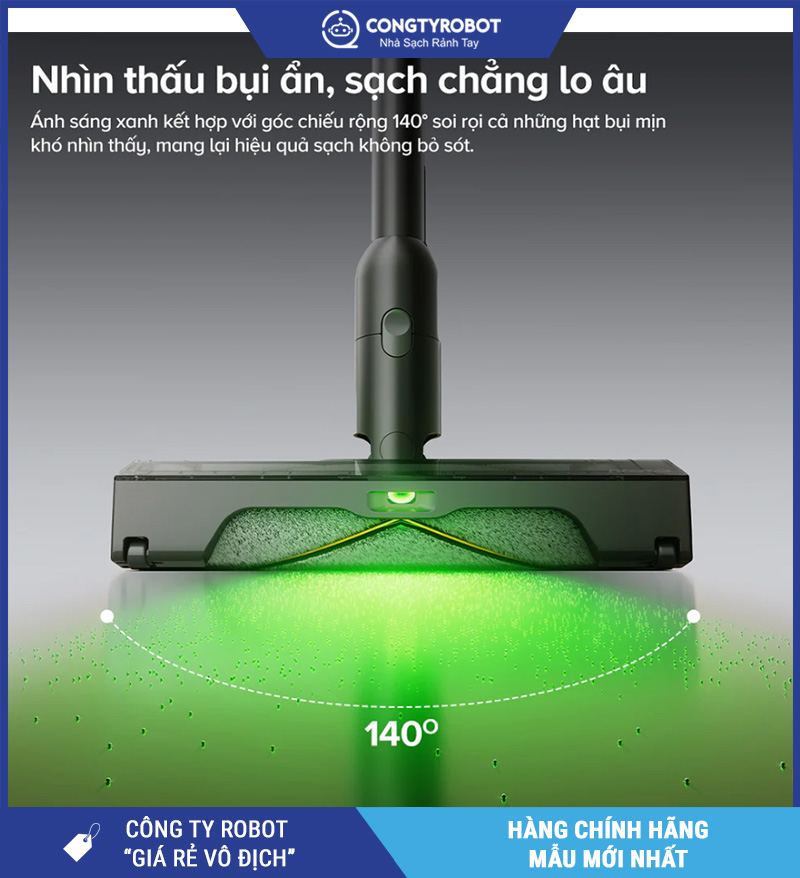 Một trong những điểm nâng tầm của Roborock H60 Ultra là đèn chiếu xanh với góc chiếu rộng tới 140° – tính năng cao cấp thường chỉ xuất hiện ở các dòng máy hút bụi tầm cao.