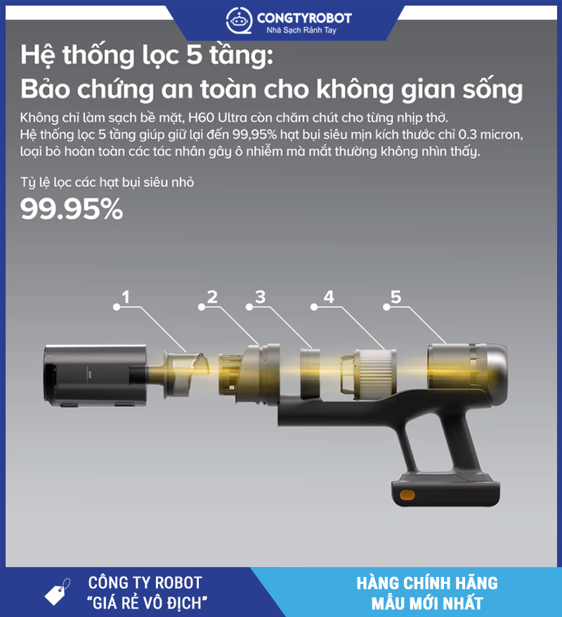 Không chỉ hút sạch bụi, Roborock H60 Ultra còn giúp bảo vệ không khí trong nhà luôn trong lành nhờ trang bị hệ thống lọc 5 lớp hiện đại. Cấu trúc lọc nhiều tầng cho phép: