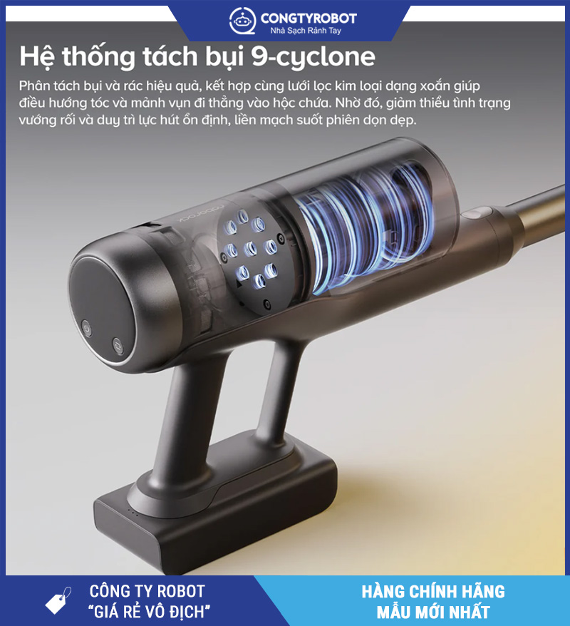 Roborock H60 Ultra sử dụng công nghệ hút 9 lốc xoáy (multi-cyclone) – tương tự công nghệ của các thương hiệu cao cấp như Dyson. Công nghệ này cho phép: