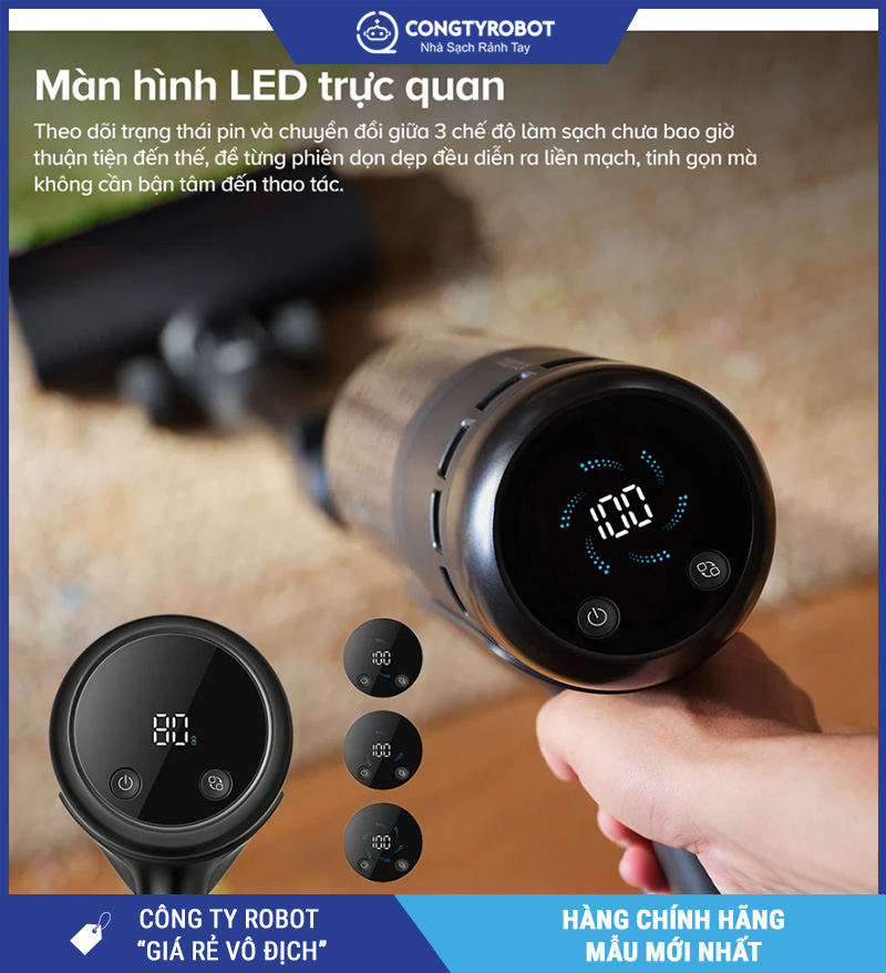 Hiển thị đầy đủ thông số quan trọng: thời lượng pin, chế độ hút, cảnh báo vệ sinh bộ lọc…