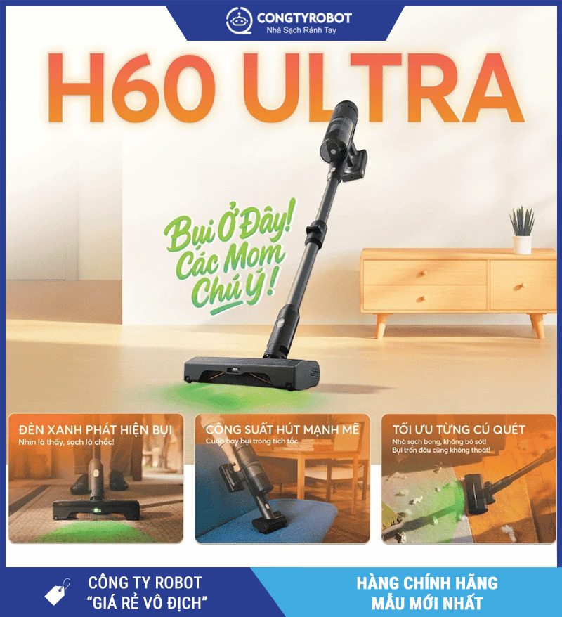 Với thiết kế gọn nhẹ, nhưng tích hợp hàng loạt công nghệ tiên tiến như: lực hút mạnh 210AW, đầu hút chống rối tóc, hệ thống lọc 5 lớp, đèn LED chiếu xanh phát hiện bụi mịn, Roborock H60 Ultra không chỉ làm sạch bề mặt mà còn bảo vệ sức khỏe người dùng nhờ khả năng lọc không khí hiệu quả.