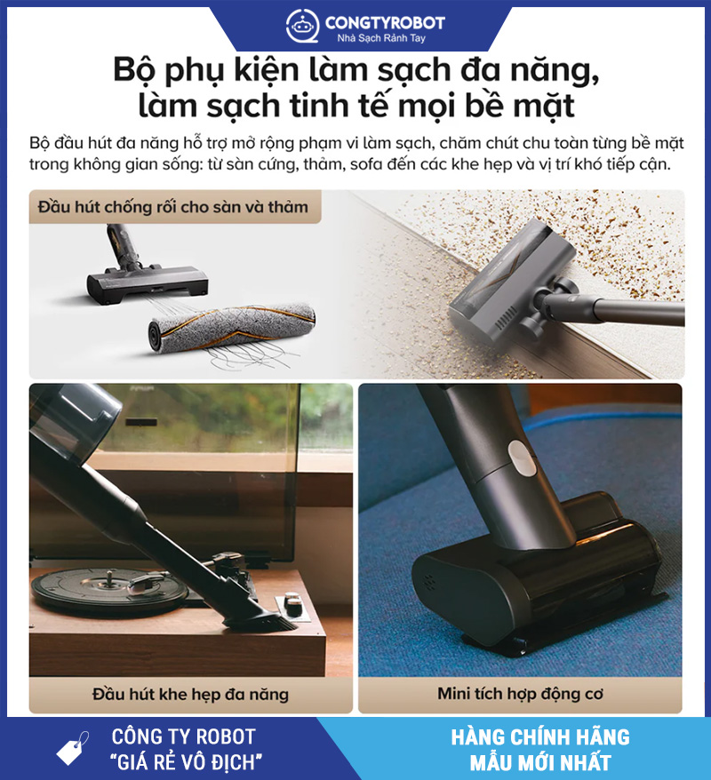 Không gian sống hiện đại đa phần có nhiều loại bề mặt và góc khuất khác nhau, vì vậy việc đi kèm nhiều đầu hút chuyên dụng là yếu tố rất quan trọng. Roborock H60 Ultra đáp ứng trọn vẹn nhu cầu này khi trang bị: