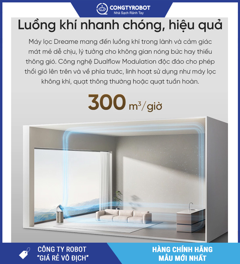 CADR 300 m³/giờ: tăng tốc độ “làm mới” không khí, kéo chỉ số về mức dễ chịu nhanh hơn khi phòng vừa có mùi hoặc bụi tăng.