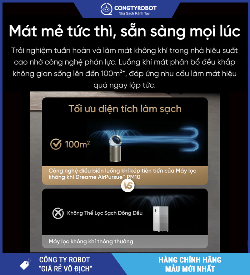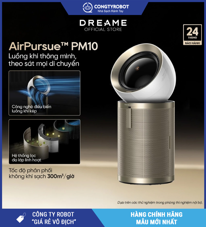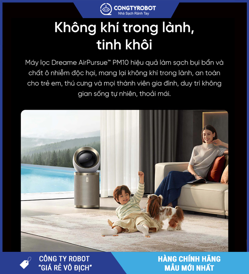 Dreame AirPursue™ PM10 – Hàng Chính Hãng là máy lọc không khí cao cấp dành cho gia đình cần lọc mạnh cho không gian lớn và muốn trải nghiệm “khí sạch đến đúng chỗ”. Với khả năng phủ tối đa 100m² và CADR 300 m³/giờ, PM10 phù hợp phòng khách, không gian mở phòng khách nối bếp, gia đình có trẻ nhỏ/người lớn tuổi hoặc nhà nuôi thú cưng cần không khí sạch ổn định hằng ngày.