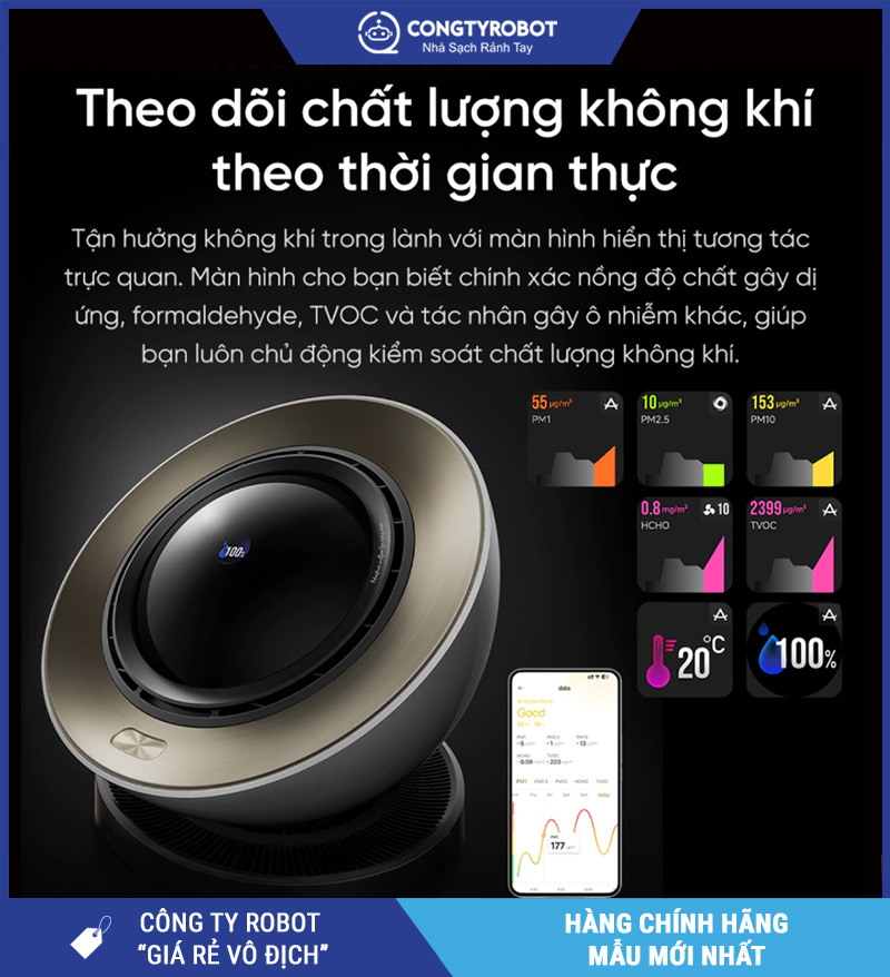 Hiển thị chỉ số chất lượng không khí theo thời gian thực để biết phòng đang sạch hay đang ô nhiễm.