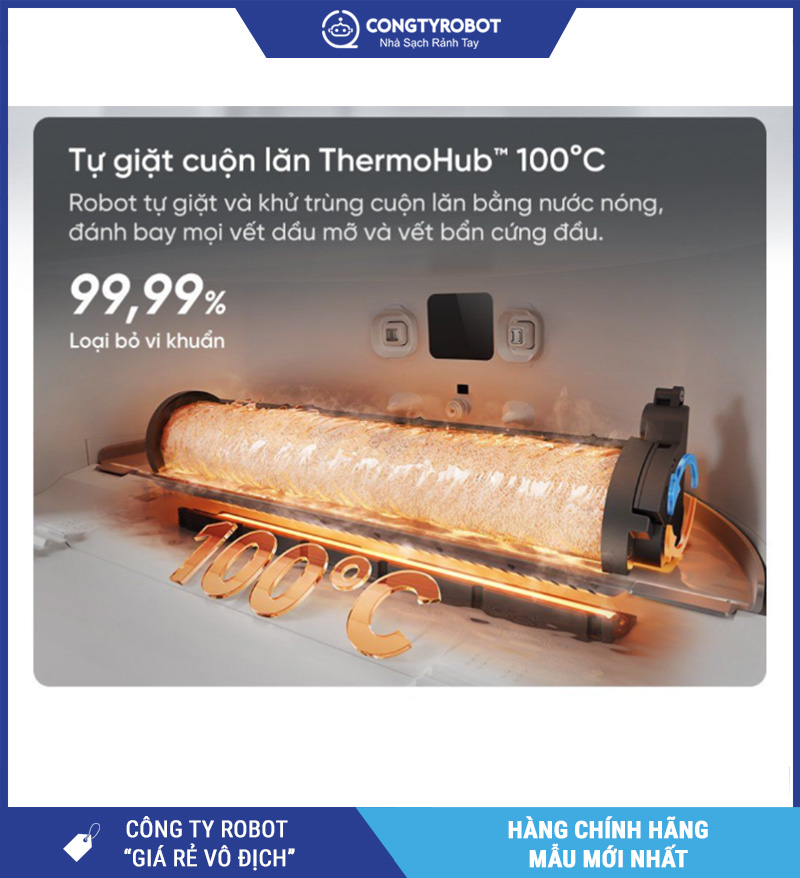 Sau khi lau, điểm khác biệt lớn nằm ở việc con lăn có được làm sạch đúng cách hay không—vì con lăn bẩn dễ gây mùi, lau loang và giảm hiệu quả ở những lần chạy sau. ThermoHub™ giải quyết triệt để bằng cơ chế tự giặt con lăn với nước nóng lên đến 100℃, giúp làm sạch sâu và giữ con lăn luôn “sẵn sàng” cho lượt lau tiếp theo.