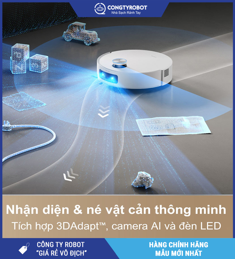 Nhà có trẻ nhỏ hoặc nhiều đồ lặt vặt (dây sạc, dép, đồ chơi) thường khiến robot bị kẹt hoặc va chạm. Bộ giải pháp 3DAdapt™ kết hợp camera AI và đèn LED giúp robot “nhìn” và “né” tốt hơn, kể cả trong điều kiện thiếu sáng như gầm giường hoặc hành lang tối.
