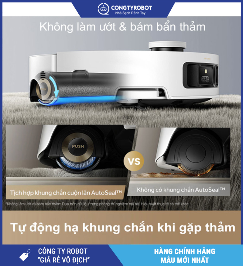 Với nhiều robot lau nhà, thách thức lớn nhất là đi qua thảm bị ẩm hoặc làm bẩn thảm do khăn lau còn ướt. AutoSeal™ (khung chắn) được thiết kế để giảm nguy cơ thấm ướt lên thảm và giúp robot linh hoạt hơn khi chuyển đổi giữa sàn cứng và thảm.