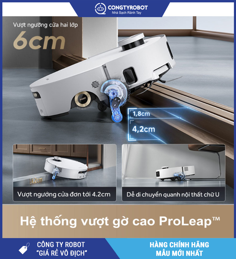 Trong nhà Việt, robot thường “ngán” các điểm chuyển sàn như nẹp cửa, gờ nhà tắm, chân bàn thấp, thảm dày, hoặc bậc nhỏ giữa các khu vực. ProLeap™ được thiết kế để giúp robot vượt chướng ngại vật mượt hơn, giảm tình trạng mắc kẹt và gián đoạn chu trình làm sạch.