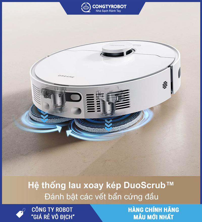 Trang bị 2 giẻ lau xoay tốc độ cao, DuoScrub™ tạo lực xoáy mạnh giúp làm sạch các vết bẩn khô như dầu mỡ, cà phê, bùn đất – thứ mà robot lau thường không xử lý được.