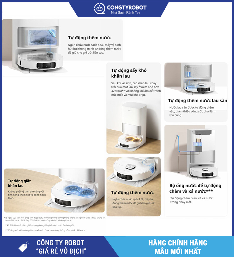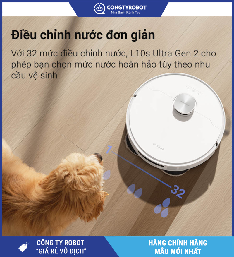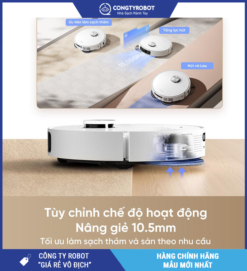 Người dùng có thể tùy chỉnh mức độ thấm nước của giẻ lau ngay trong ứng dụng, phù hợp từng loại sàn (gỗ, gạch, đá...). Đồng thời, robot có khả năng tự pha nước lau sàn khi cần, tăng hiệu quả khử mùi – diệt khuẩn – tạo hương thơm dễ chịu.