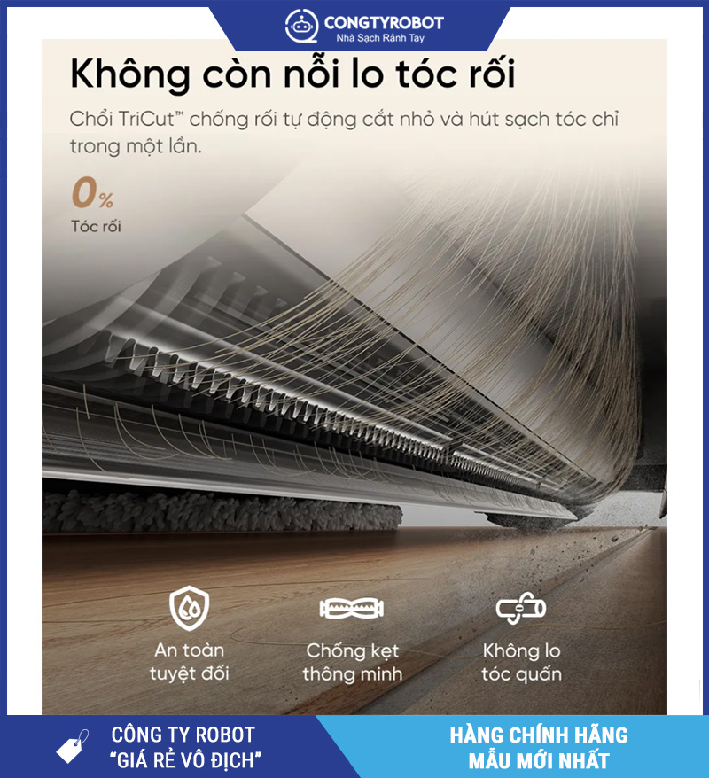 Một trong những vấn đề gây khó chịu nhất khi dùng robot hút bụi là tóc, lông thú cuộn rối quanh chổi, khiến robot giảm hiệu quả hút và phải vệ sinh thủ công thường xuyên. Với Dreame L50 Ultra CE, vấn đề này được giải quyết nhờ hệ thống chổi chính TriCut™ thông minh.