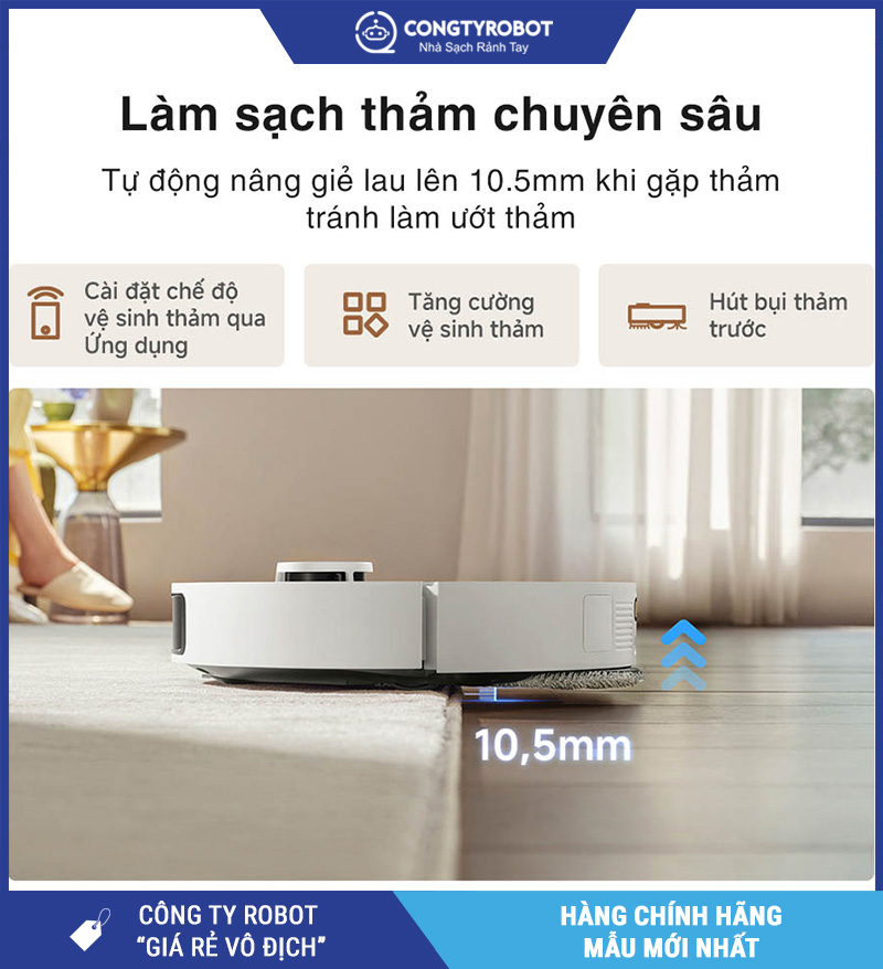 Nhiều người dùng lo ngại robot lau nhà có thể làm ướt hoặc bẩn thảm. Dreame L50 Ultra CE khắc phục triệt để với cơ chế nâng giẻ lau tự động lên đến 10.5mm, giúp vệ sinh thảm hiệu quả mà không ảnh hưởng đến chất lượng thảm.