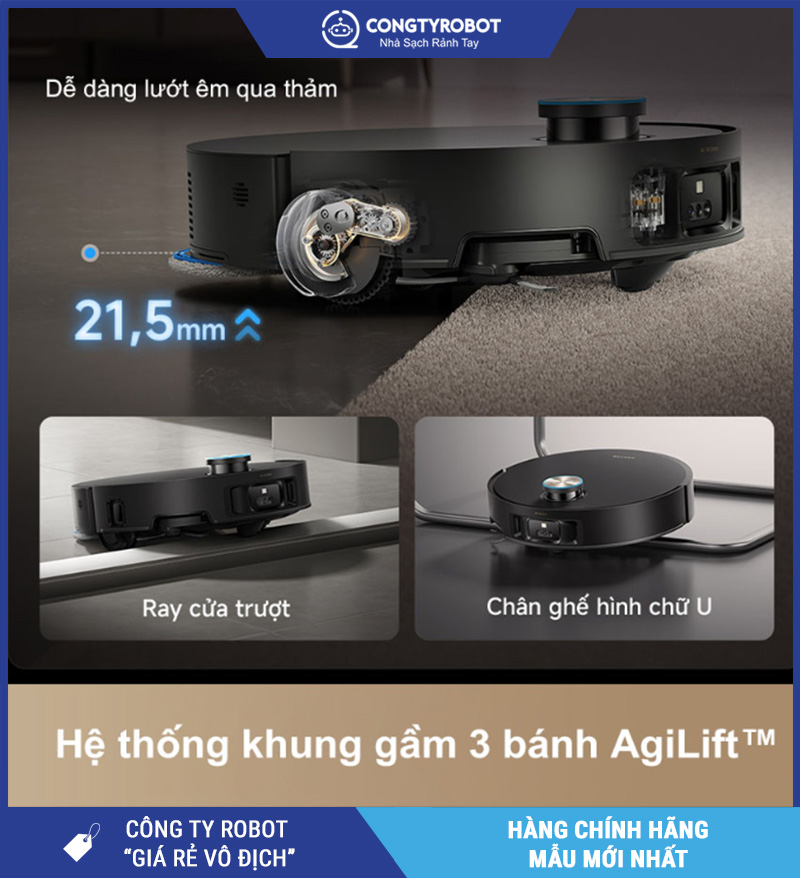 Để robot có thể di chuyển linh hoạt trên nhiều loại địa hình trong nhà, Dreame đã trang bị cho Matrix 10 Ultra hệ thống khung gầm Triple-Wheel AgiLift™ – thiết kế độc quyền với ba bánh vận hành độc lập, giúp robot dễ dàng:
