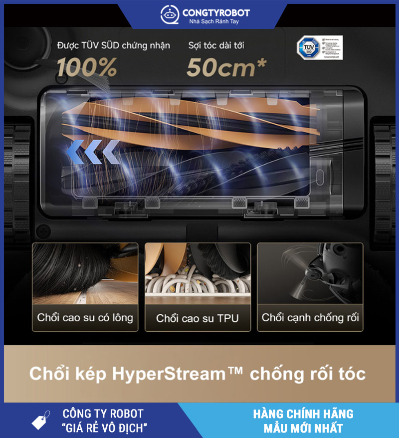 Với hệ thống này, robot có thể làm sạch sâu hơn ở rãnh gạch, mép tường, thảm dày… mà không cần người dùng phải tháo chổi vệ sinh thường xuyên.